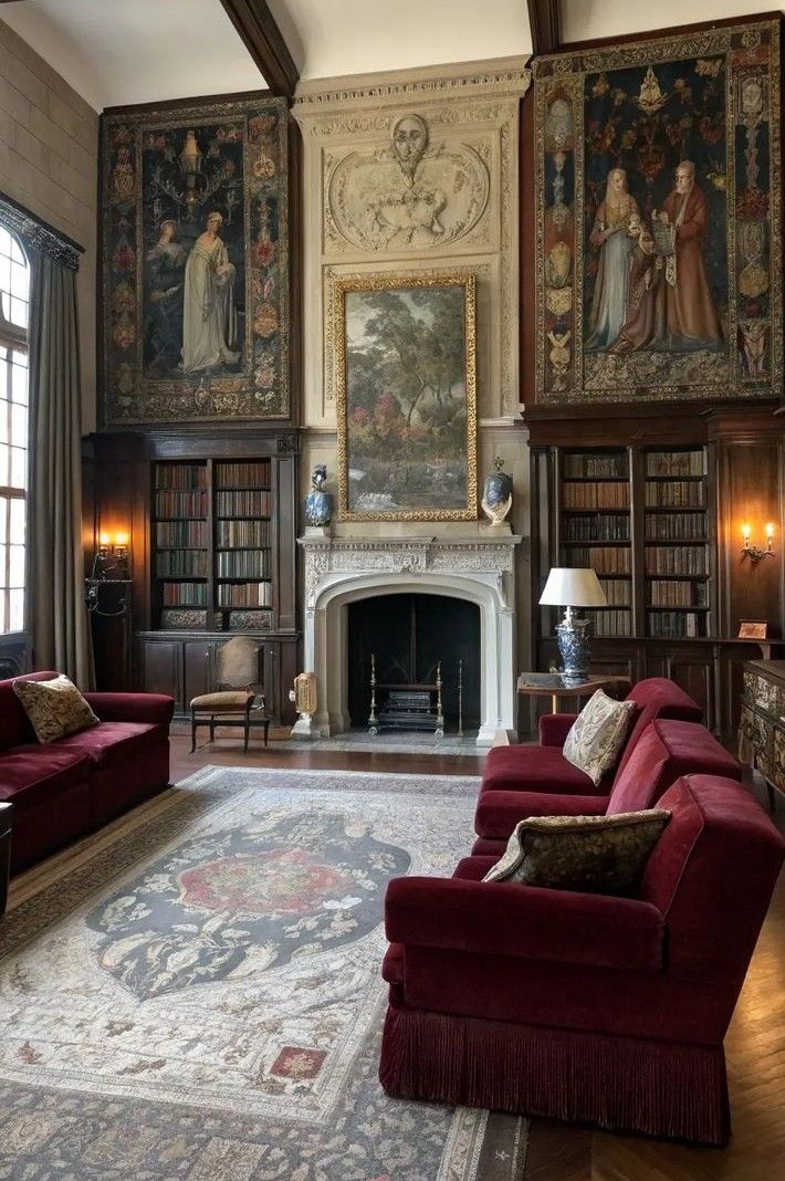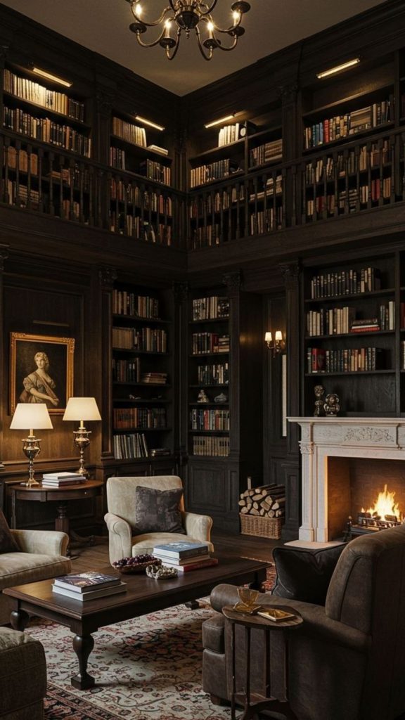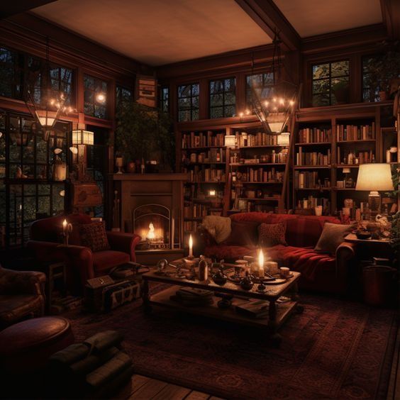 Los salones Dark Academia se caracterizan por su atmósfera intelectual y melancólica, que combina misterio y elegancia clásica. Espacios con techos altos, estanterías llenas de libros y rincones de lectura crean un entorno introspectivo y acogedor. La luz tenue y la presencia de materiales naturales como madera, cuero y tejidos pesados refuerzan la sensación de historia, estudio y sofisticación discreta.