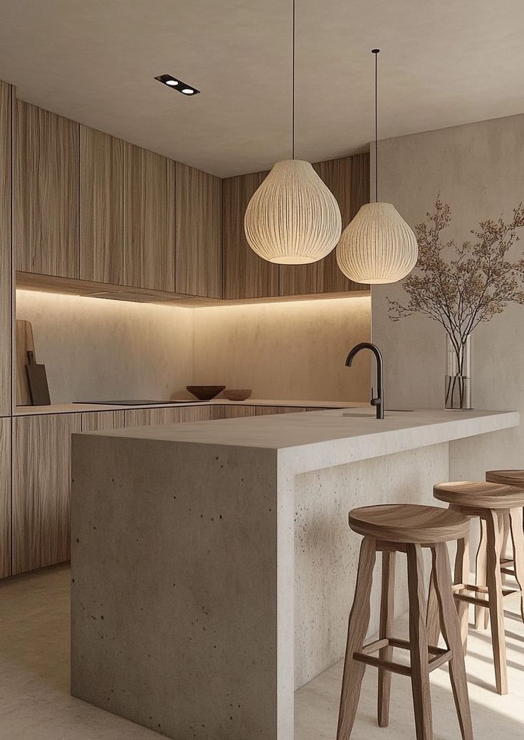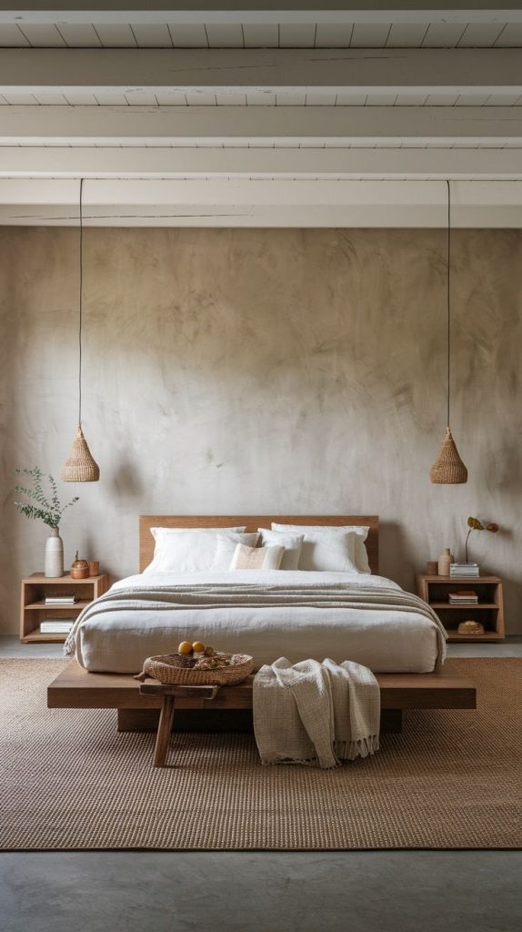 Predominan los colores neutros como blanco, gris y beige, con ocasionales acentos en tonos sólidos. Los materiales suelen ser sencillos y de calidad, como madera clara, metal y vidrio.
